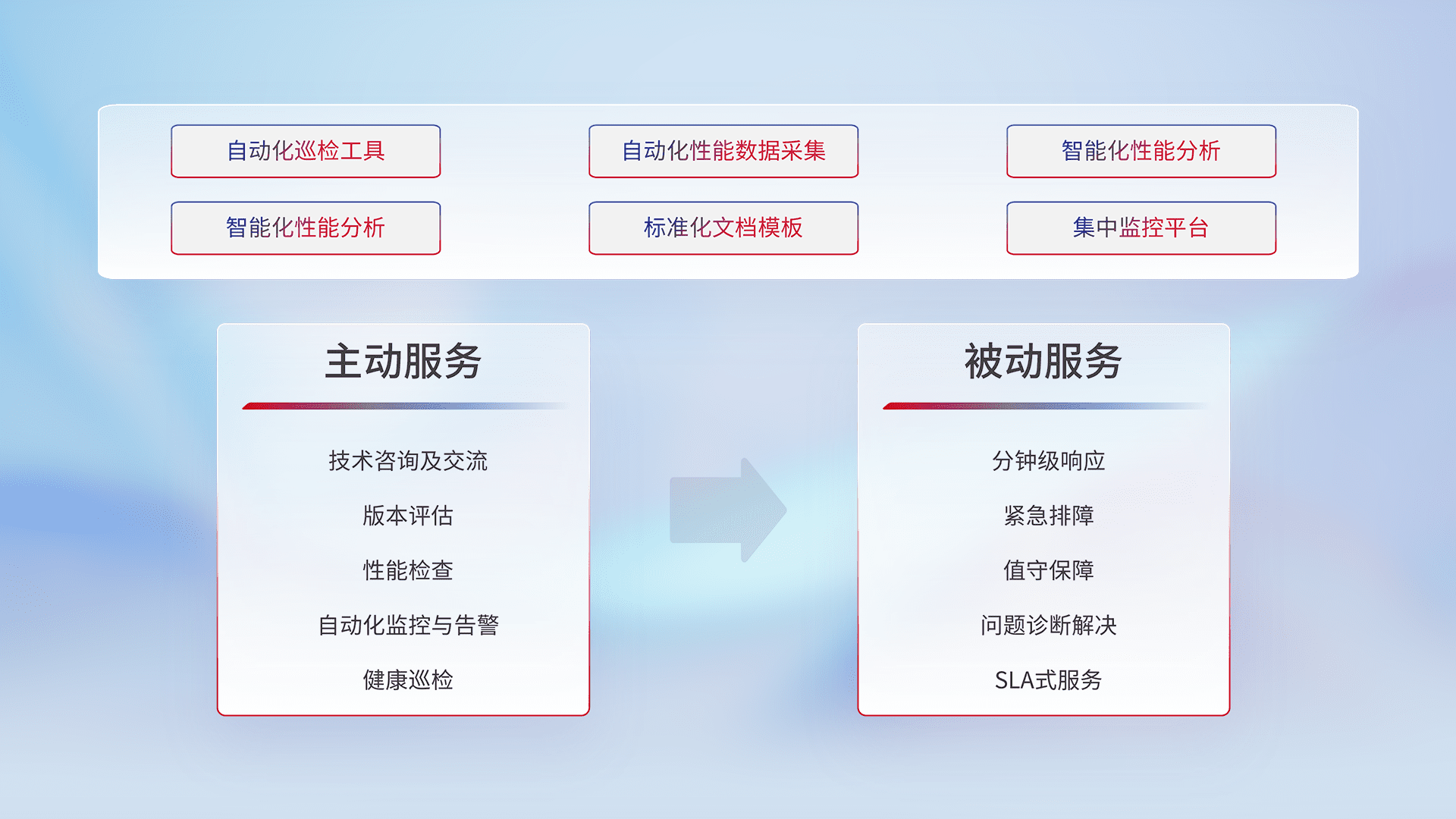 智能化工具和标准化文档,,,保障服务质量,,,,提供主动服务(包含技术咨询、、版本评估、、、性能检查、、自动化监控与告警、、健康巡检)和被动服务包含(分钟级响应、、紧急排障、、值守保障、、、、问题诊断解决、、SLA服务)。。。